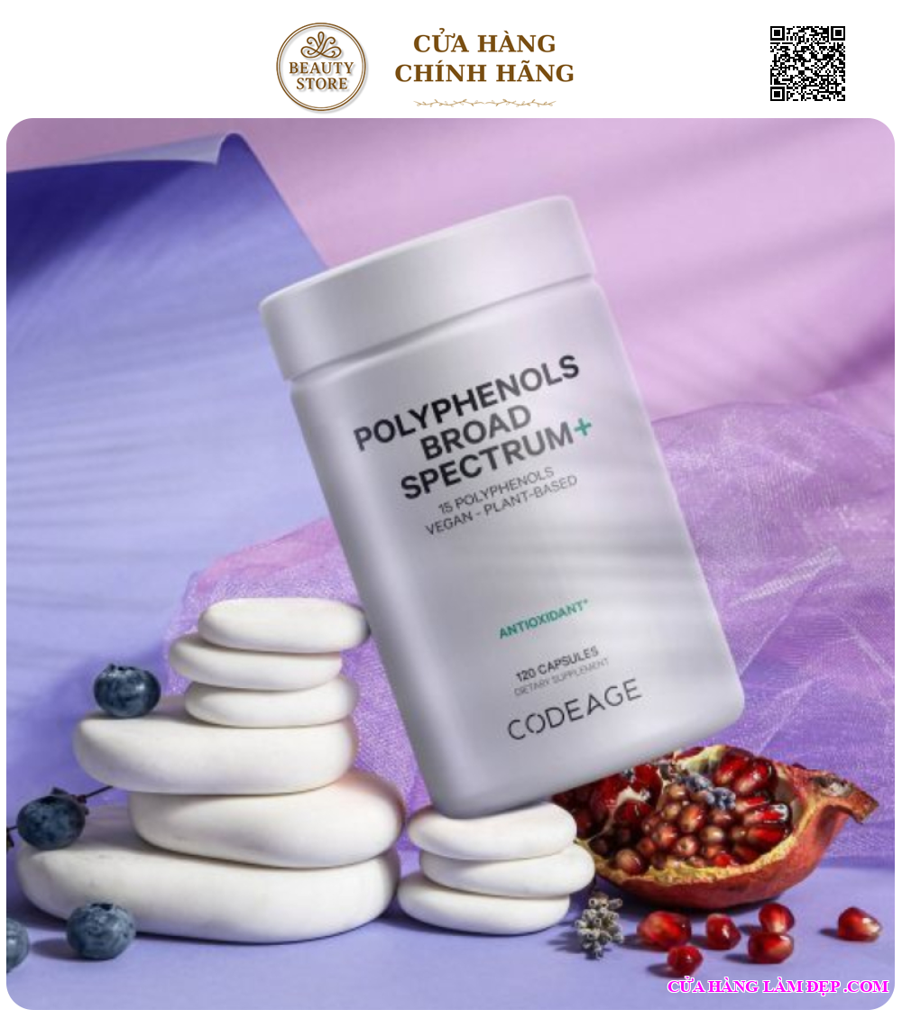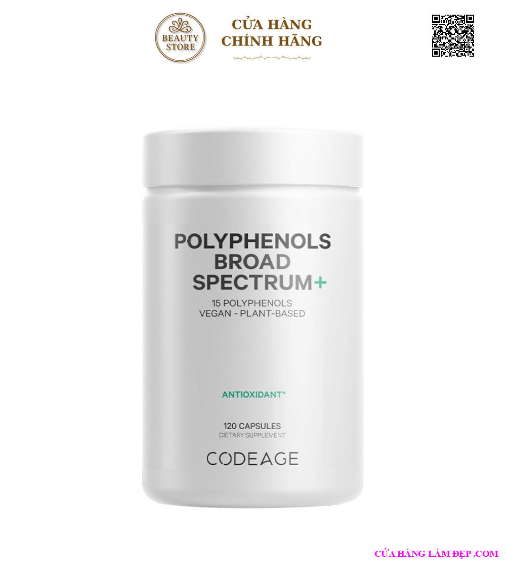 Polyphenols Broad Spectrum là thực phẩm bảo vệ sức khỏe cao cấp của thương hiệu Codeage (Mỹ), với công thức chứa đến 15 loại polyphenol từ thực vật và trái cây tự nhiên, hỗ trợ chống oxy hóa mạnh mẽ, bảo vệ da khỏi tác động của ánh nắng mặt trời và cải thiện sắc tố da từ bên trong.