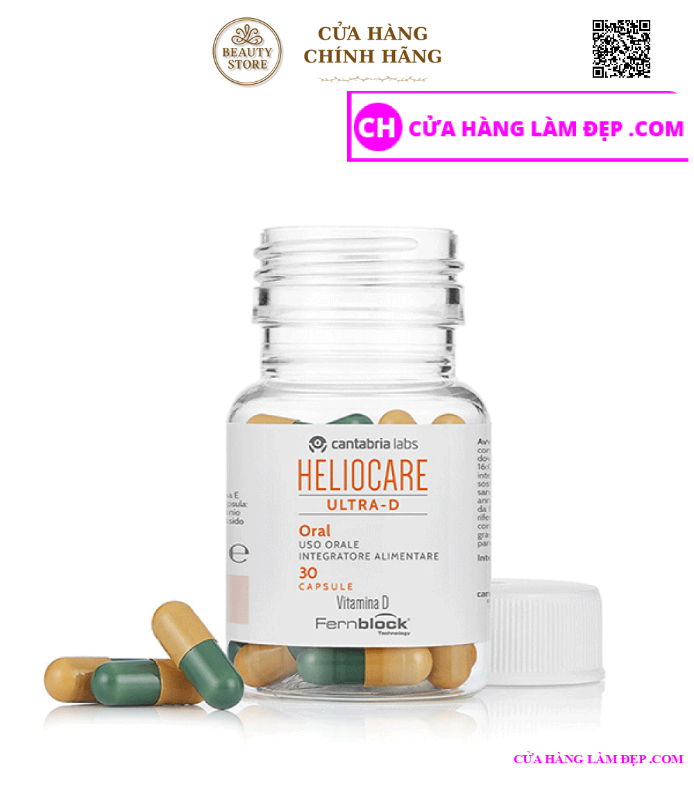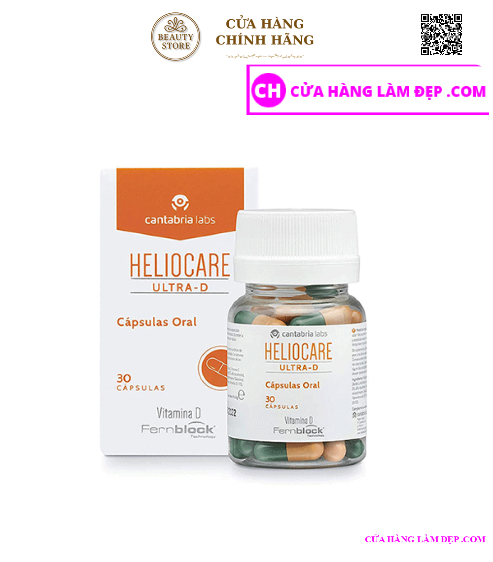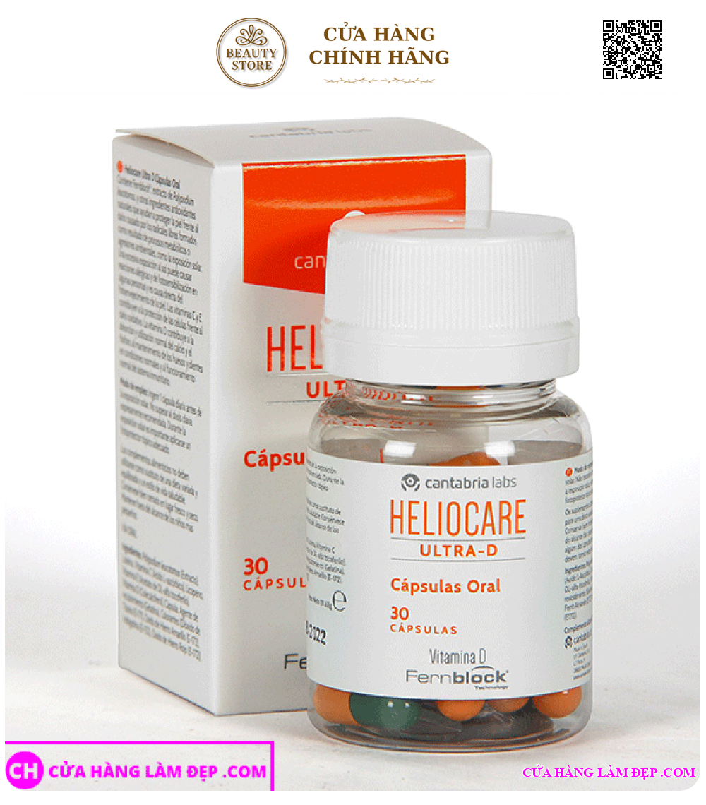 - Sản phẩm Viên Uống Heliocare Ultra-D Hỗ Trợ Chống Nắng chứa hàm lượng cao Fernblock® ( chiết xuất từ lá dương xỉ ) giúp tăng sức đề kháng của da khỏi ánh nắng mặt trời từ viên đầu tiên, cũng như trung hòa và tái tạo làn da khỏi tác hại của ánh sáng mặt trời. Sản phẩm với khả năng bảo vệ tối ưu ngay cả khu vực khó tiếp cận nhất (da đầu, mắt, tai, v.v.). Công thức hoàn chỉnh của sản phẩm bao gồm vitamin D, C và E, lutein và lycopene. Không chứa gluten.