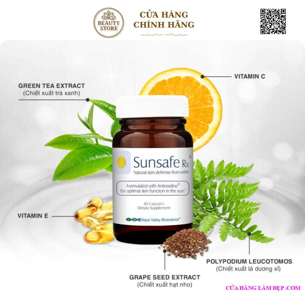 Viên uống chống nắng và làm sáng da Sunsafe Rx được bào chế với công thức ưu việt. Thành phần có chứa các chất chống oxy hóa mạnh mẽ, sẽ giúp cơ thể chống lại quá trình oxy hóa của da khi tiếp xúc với tia UV có trong ánh nắng mặt trời, từ đó loại bỏ hoàn toàn các gốc tự do gây hại để làm giảm tác hại của nắng đối với da, đồng thời duy trì làn da trắng sáng hoàn hảo và tươi trẻ với thời gian.