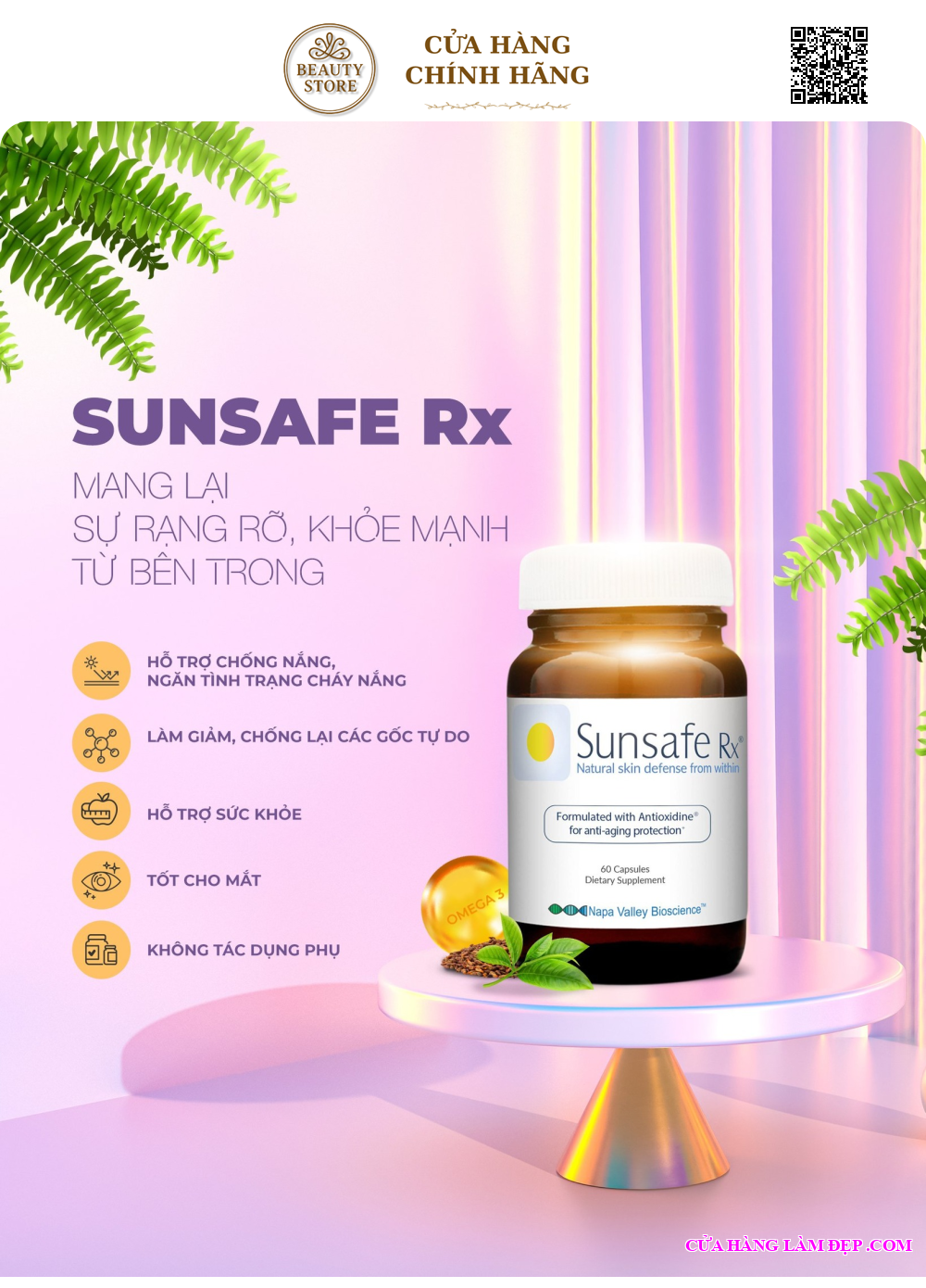 Viên uống chống nắng và làm sáng da Sunsafe Rx được bào chế với công thức ưu việt. Thành phần có chứa các chất chống oxy hóa mạnh mẽ, sẽ giúp cơ thể chống lại quá trình oxy hóa của da khi tiếp xúc với tia UV có trong ánh nắng mặt trời, từ đó loại bỏ hoàn toàn các gốc tự do gây hại để làm giảm tác hại của nắng đối với da, đồng thời duy trì làn da trắng sáng hoàn hảo và tươi trẻ với thời gian.