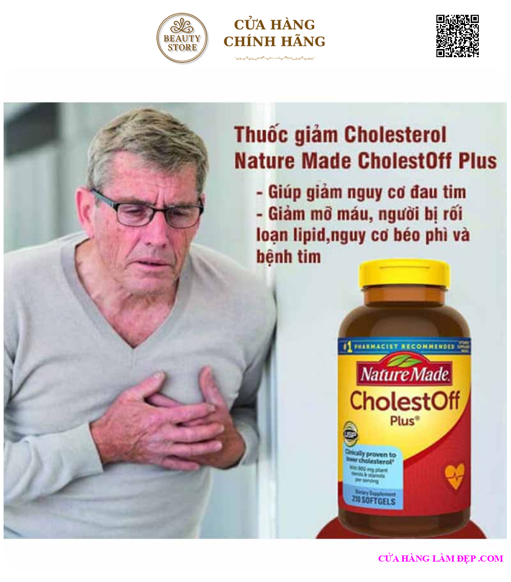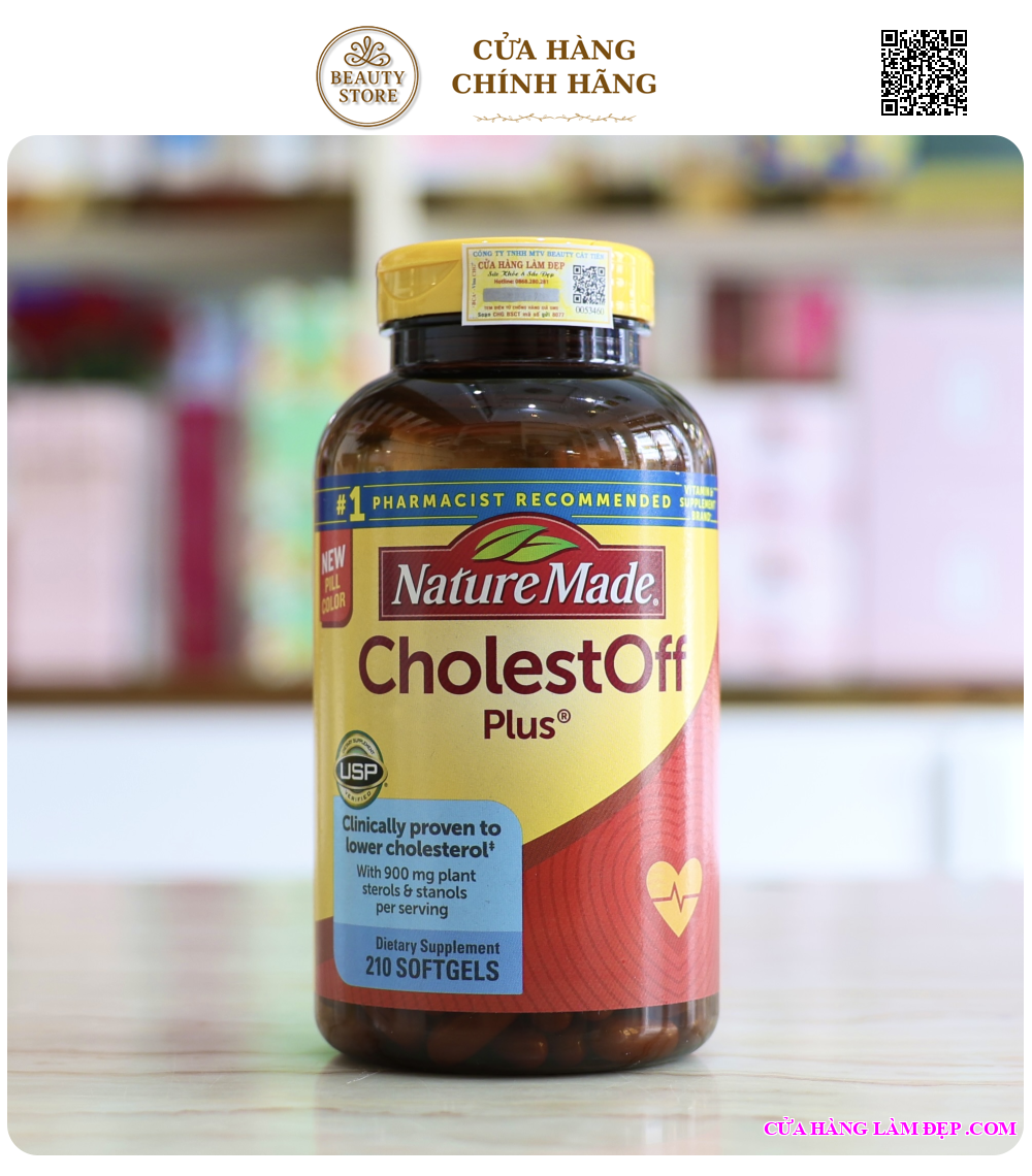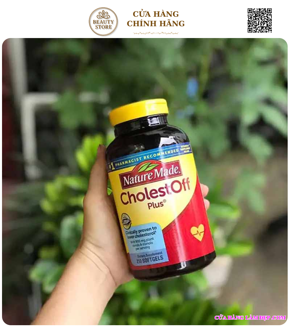 - Cholesterol cao là một trong những “căn bệnh” nguy hiểm của thời đại, rất dễ mắc phải nhất là những người béo phì, thừa cân, những người thường xuyên ăn uống nhiều chất béo và ít vận động. Nam giới trên 45 tuổi và nữ trên 55 tuổi có nguy cơ cao mắc bệnh tim mạch do cholesterol xấu. - Hiểu được điều này, Nature Made - thương hiệu thực phẩm chức năng uy tín của Mỹ đã điều chế nên giảm Cholesterol Nature Made CholestOff Plus 210 viên. - Thành phần của giảm mỡ máu của Mỹ được chứng minh là giúp làm giảm cholesterol sau 3 tuần. Sản phẩm hiện đang rất được ưa chuộng và đánh giá cao tại Mỹ và nhiều quốc gia trên Thế giới.