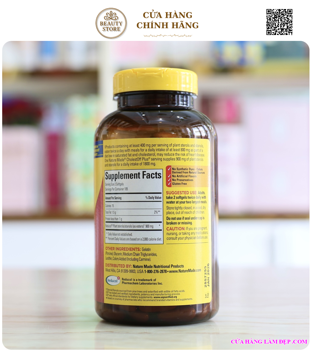 - Với hỗn hợp độc quyền của sterol & stanol thực vật (phytosteol), Nature Made CholestOff Plus 900mg có thể làm giảm cholesterol xấu trong máu bằng cách hấp thụ cholesterol trong chế độ ăn vào máu. - Giúp giảm nguy cơ đau tim. - Giảm mỡ máu, người bị rối loạn lipid máu và bệnh tim mạch nên sử dụng viên uống giảm cholesterol của Nature Made để giảm nguy cơ béo phì và bệnh tim. - Cung cấp thêm 1 lượng Plant Sterols và Stamols mỗi ngày.