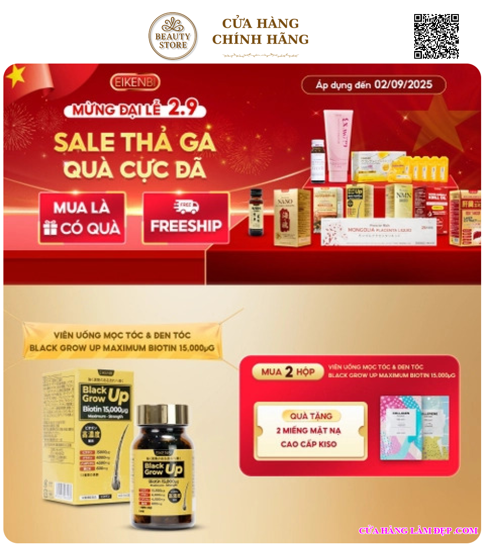 Viên Uống Mọc Tóc & Đen Tóc Black Grow Up Maximum Biotin 15,000µg Eikenbi là viên uống chăm sóc tóc cao cấp đến từ thương hiệu Eikenbi Nhật Bản, nổi bật với hàm lượng Biotin lên đến 15.000µg – hỗ trợ mọc tóc, ngăn rụng tóc và phục hồi tóc hư tổn từ bên trong. Sản phẩm còn giúp kích thích tóc đen tự nhiên, cải thiện độ chắc khỏe và bóng mượt cho mái tóc.