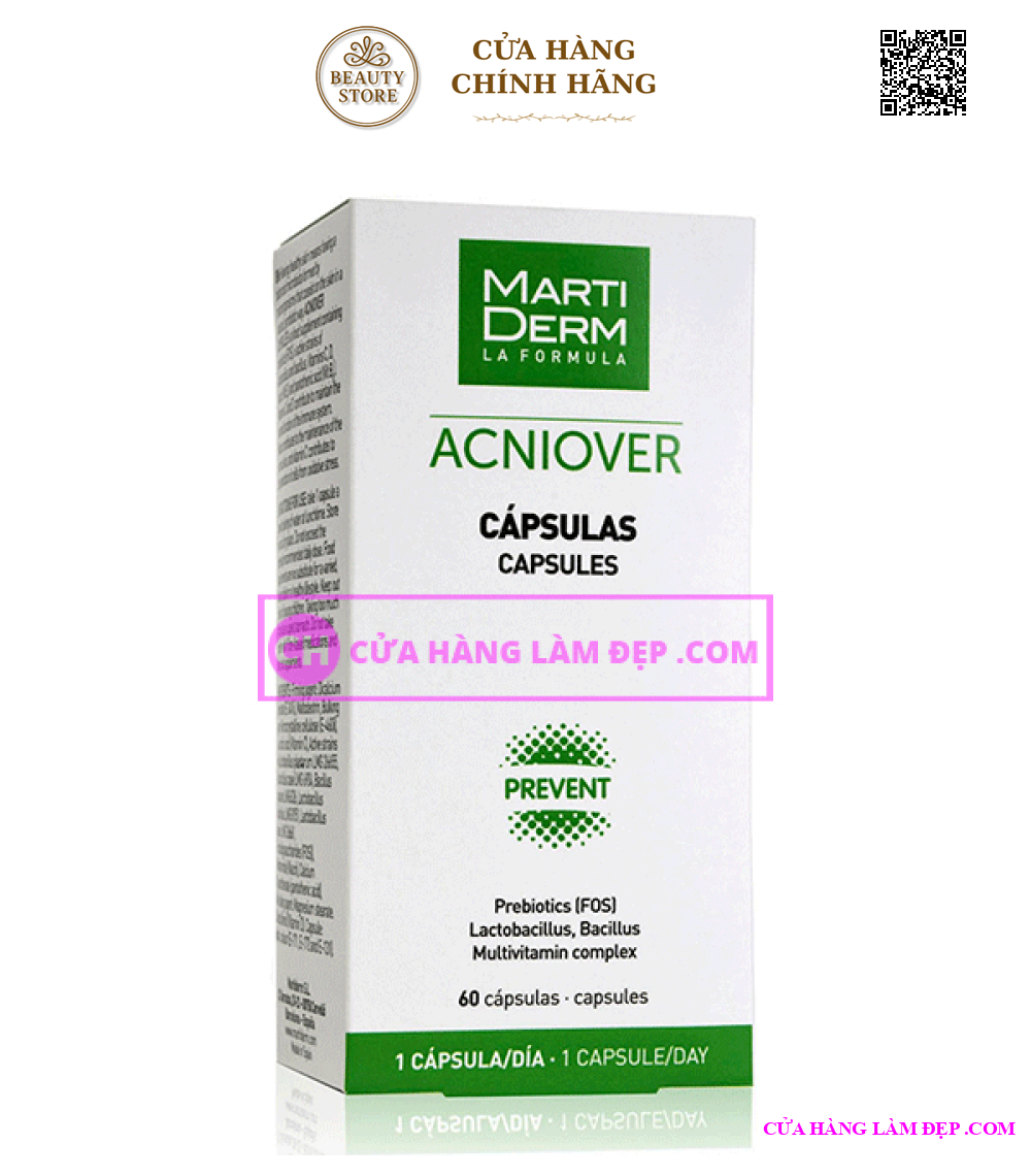 Viên uống bổ sung MartiDerm Acniover Capsules giúp ngăn ngừa mụn bùng phát trên làn da dễ nổi mụn. Công thức sản phẩm bao gồm các lợi khuẩn Prebiotics & Probiotics, kết hợp cùng Niacinamide, Vitamin C & D... nhằm hỗ trợ cân bằng lại hệ vi khuẩn đường ruột đang mất cân bằng do sử dụng uống điều Giảm Mụn trong thời gian dài, giúp ổn định làn da từ ngay bên trong, đồng thời cũng là bước đầu tiên giúp ngăn ngừa mụn bùng phát.