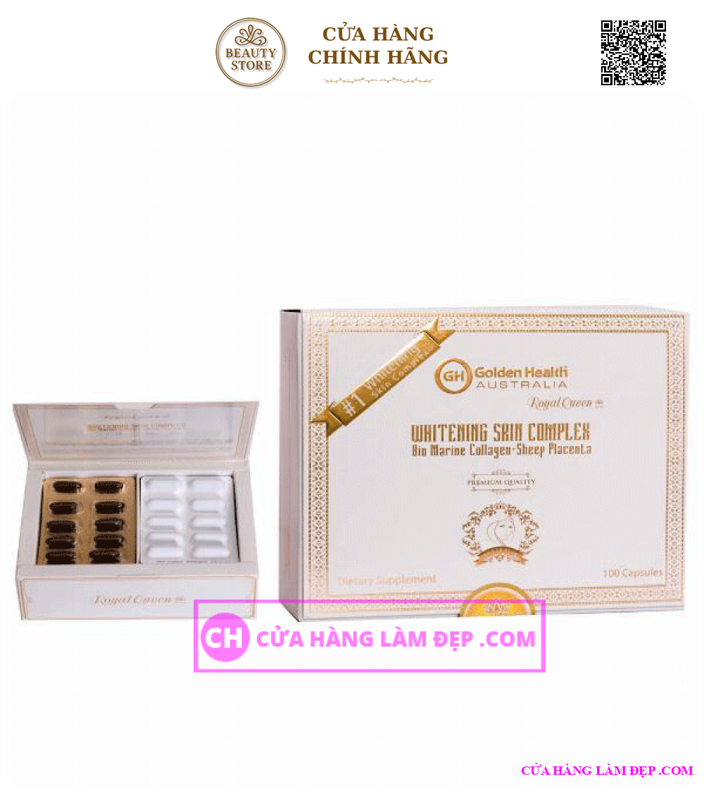 - Viên uống trắng da Golden Health Royal Whitening Skin Complex là một hợp chất bổ sung cao cấp kết hợp giữa viên uống nhau thai cừu và viên uống collagen biển đến từ thương hiệu chăm sóc sức khỏe và làm đẹp danh tiếng của Úc – Golden Health Royal Queen. Sản phẩm có công dụng trong việc tối đa hoá làm trắng da và cung cấp hỗ trợ dinh dưỡng đầy đủ cho nhu cầu chăm sóc sức khỏe tổng quát.