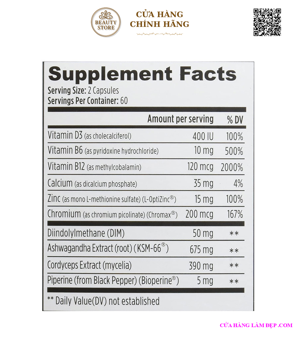 Vitamin D3, Vitamin B6, Vitamin B12, Calcium, Zinc, Chromium, Diindolymethany, Ashwagandha Extract, Cordyceps Extract, Piperine.