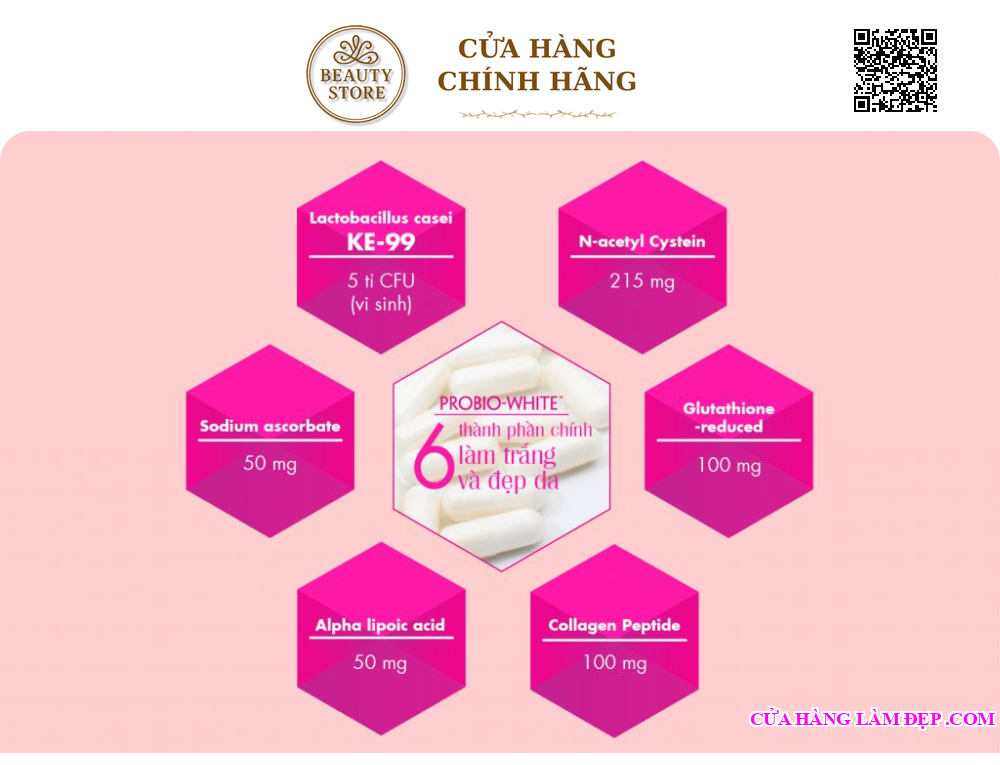 - Men vi sinh Lactobacillus Casei, KE-99: Đây là thành phần duy nhất được cấp bằng sáng chế độc quyền, giúp cải thiện hệ tiêu hoá khoẻ mạnh để hấp thu tối ưu các hoạt chất dưỡng trắng khi đưa vào cơ thể.