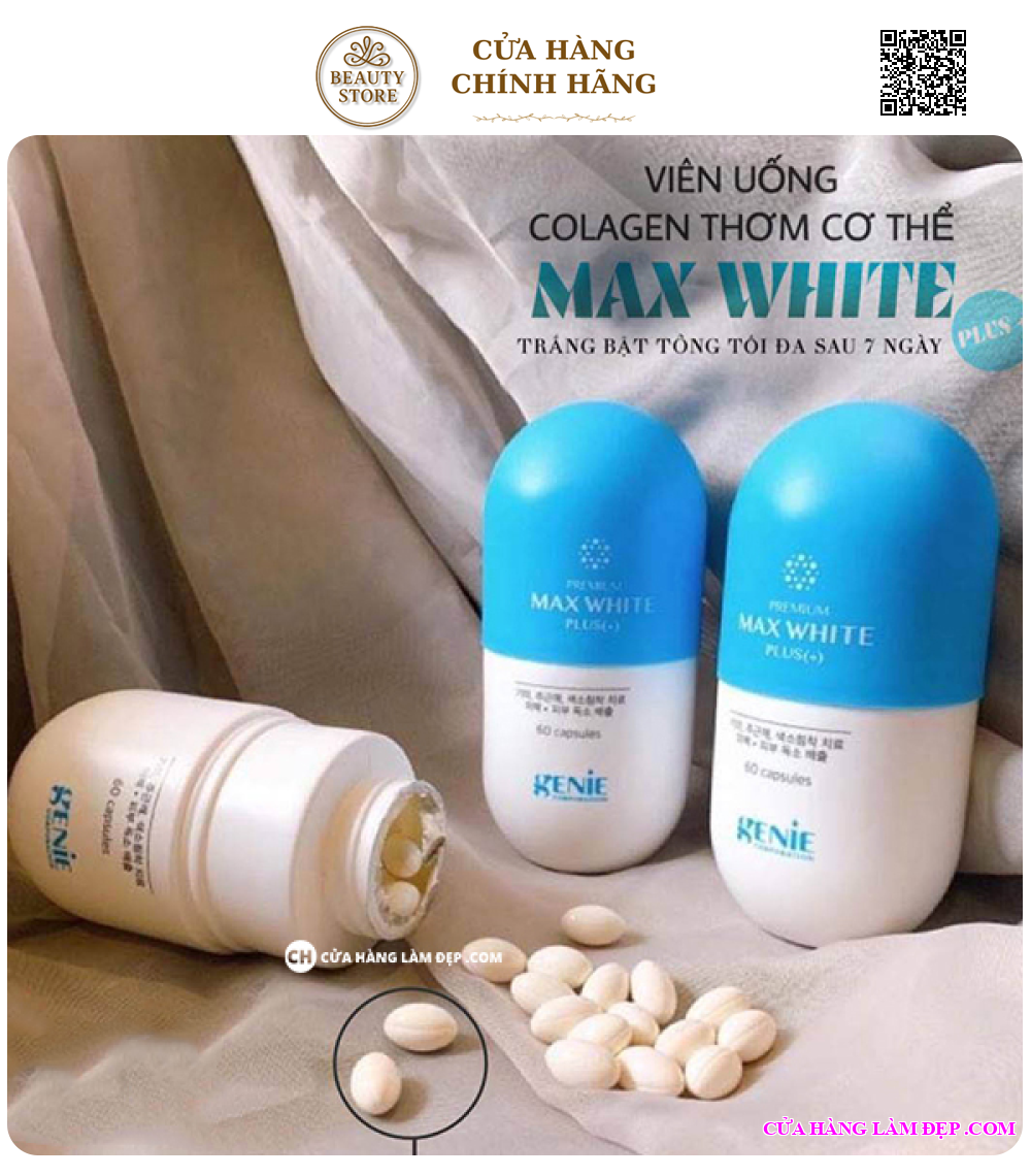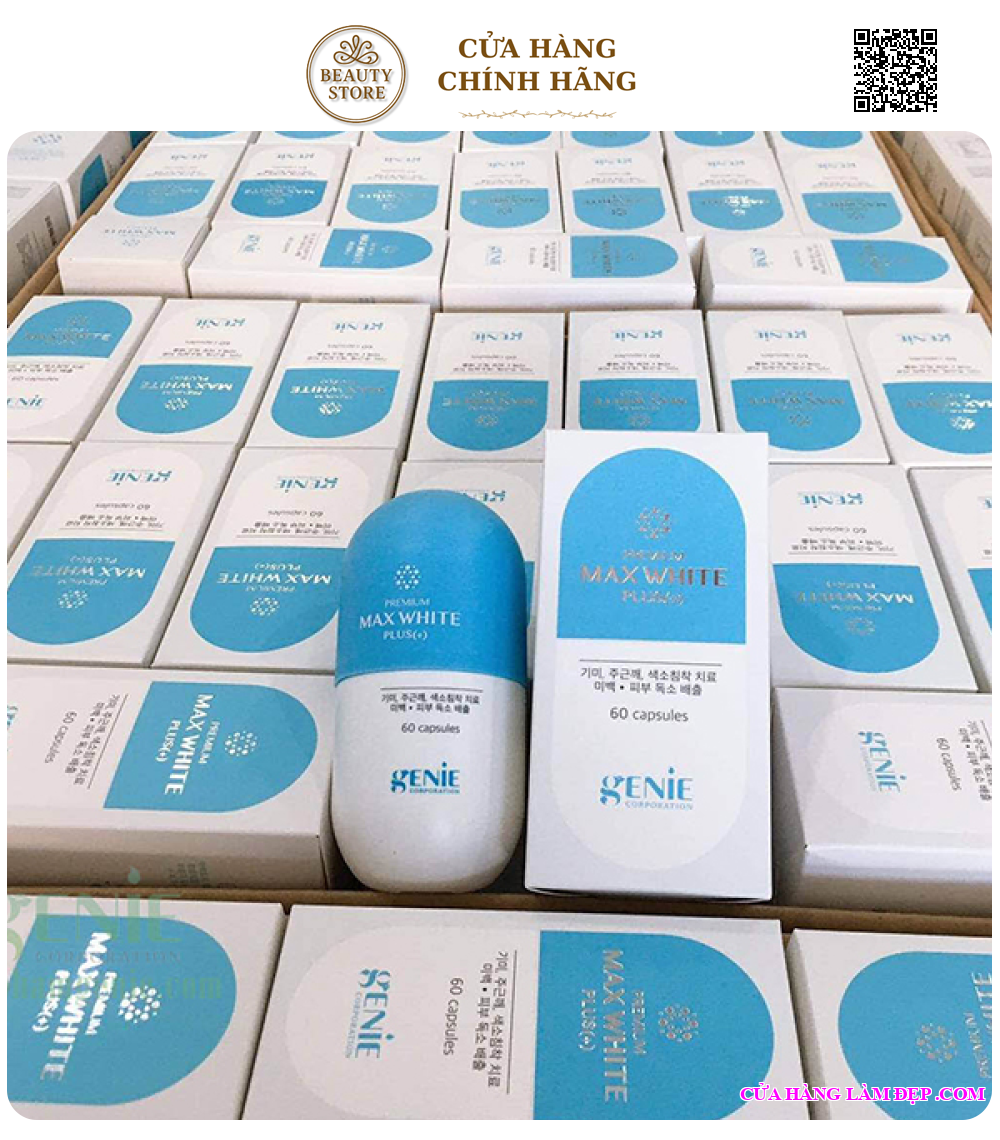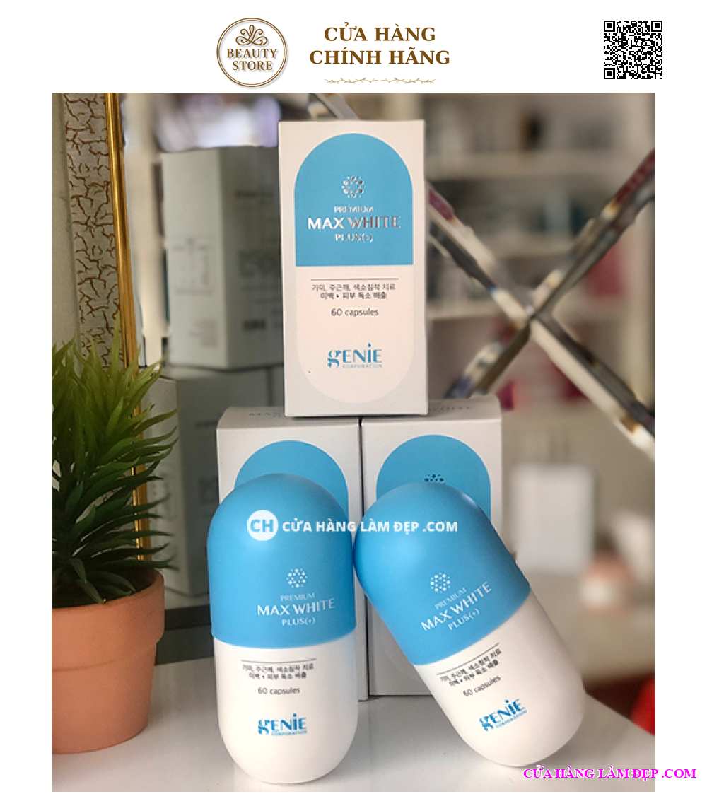 - Viên Uống Trắng Da Max White Plus (+) Softcapsule của thương hiệu Genie xuất xứ từ Hàn Quốc . Tất cả các sản phẩm của Genie đều được chứng nhận chất lượng về bộ y tế Hàn Quốc và FDA Hoa Kỳ . Để viên uống trắng da đến tay người dùng , sản phẩm bắt buộc phải trải qua các bước kiểm tra nghiêm ngặc .