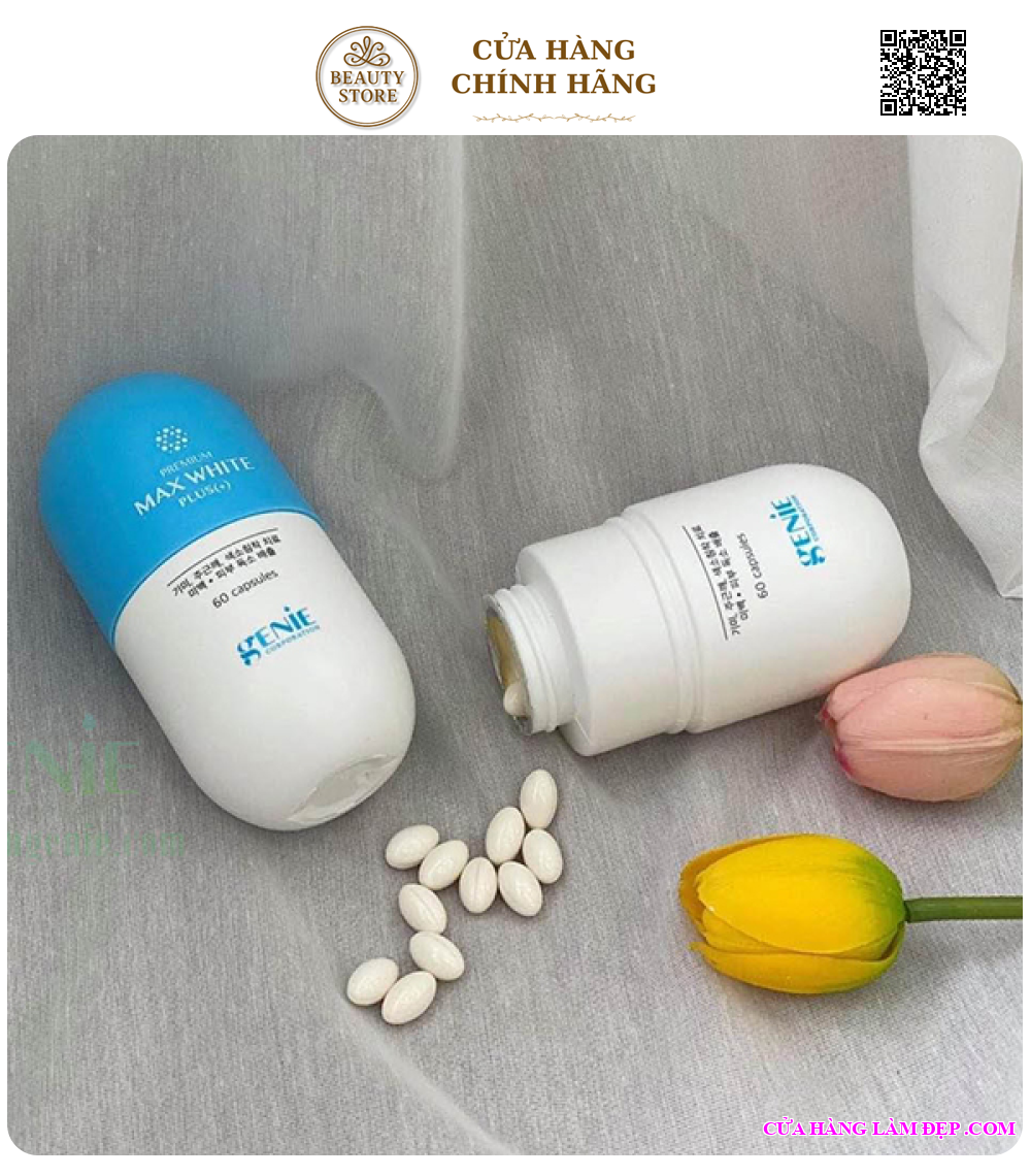 - Genie Premium Max White Plus làm trắng da, chống oxy hóa, chống lão hóa trì hoãn, chống làm sạm da đen, làm đều màu da (đốm gan, nhược điểm, tàn nhang) từ sâu bên trong.Là công thức softgel duy nhất trên thị trường hiện nay, hấp thụ gấp 30 lần so với các sản phẩm khác, vì vậy tất cả các chất dinh dưỡng có thể được hấp thụ vào xương.
