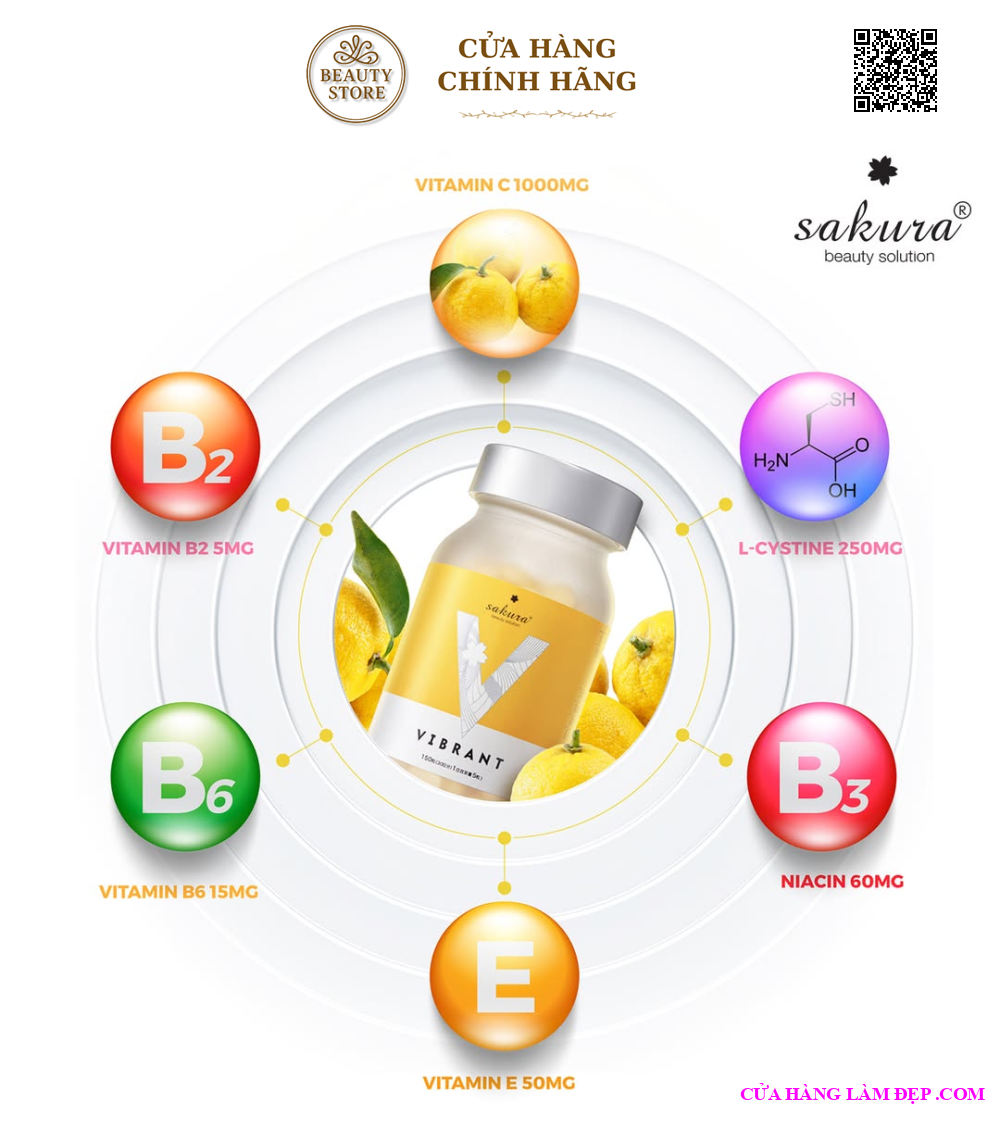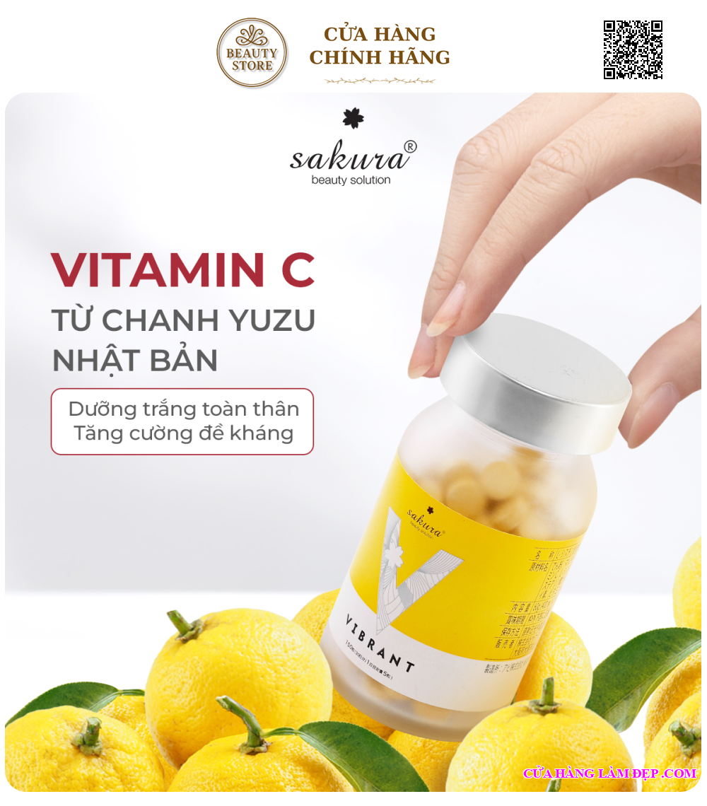 Viên Uống Trắng Da, Ngăn Ngừa Sạm Nám Sakura Vibrant Nhật Bản với nguồn vitamin C dồi dào chiết xuất từ trái Yuzu vùng biển đảo Shikoku Nhật Bản bảo vệ làn da khỏi các tác động của môi trường, hỗ trợ giúp da sáng hồng tự nhiên, ngăn ngừa sạm nám.
