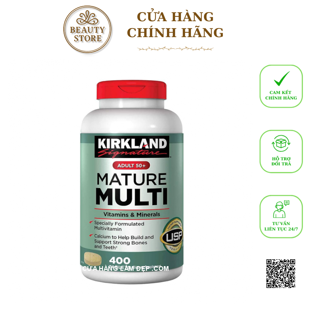 - Viên vitamin tổng hợp cho người lớn tuổi trên 50 hỗ trợ xương khớp, thị lực, hệ miễn dịch và chống oxy hóa, bảo vệ cơ thể, giúp phòng ngừa bệnh tật. Những người lớn sau 50 thường có nguy cơ cao bị loãng xương, đau khớp, suy giảm thị lực, dễ ốm bệnh, vậy thì Vitamin tổng hợp Kirkland Mature 400 viên chính là lý tưởng nhất.