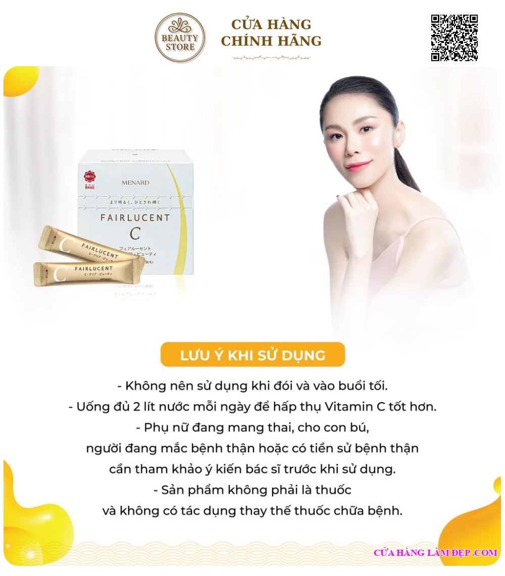 - Dưỡng trắng, giảm nám, chống nắng bền vững; hỗ trợ Hỗ Trợ Ngừa Lão Hóa, cải thiện nội tiết, tăng cường sức đề kháng toàn diện: Bổ sung 1 gói Siêu thực phẩm Menard Fairlucent C vào buổi sáng và 1 gói vào buổi trưa. Có thể uống trực tiếp hoặc pha với nước.